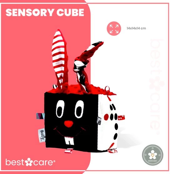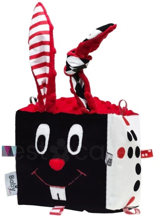 ? WETENSCHAP – De contrasterende zintuiglijke kubus heeft een belletje om de aandacht van je kleintje te trekken en zijn gehoor te ontwikkelen, terwijl de lange oren het gemakkelijk maken om vast te pakken – perfect om aan te trekken, over te wrijven en op te kauwen.
