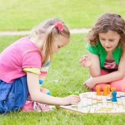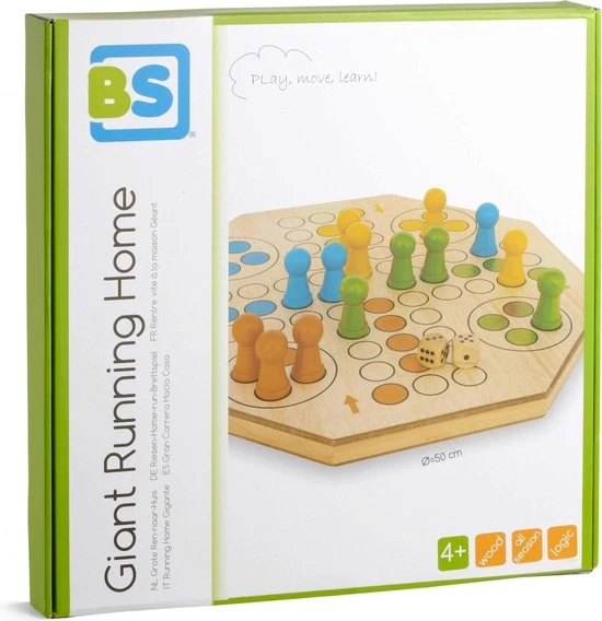 Extra grote ren naar huis van BS?, dit spel is lekker groot zodat je gemakkelijk buiten in de tuin kunt spelen of heerlijk met z’n allen binnen op de grond. Wie weet het snelst zijn pionnen naar huis te brengen? Bord 50x50cm