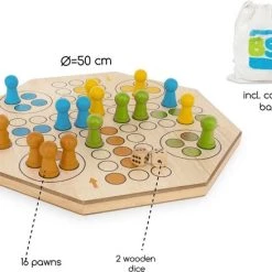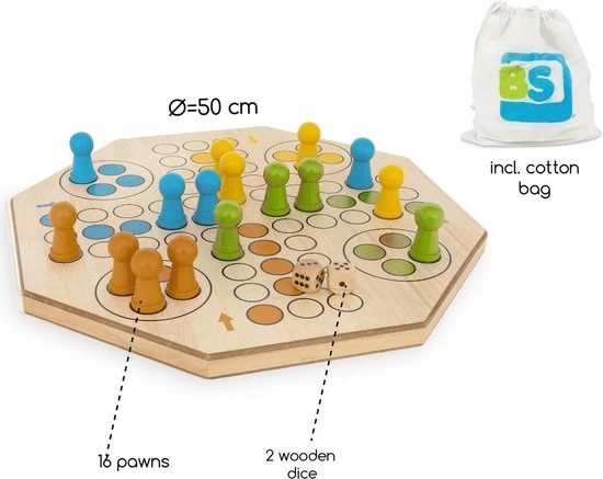 | Verpakkingsinhoud | 1, houten, bord, 16, grote, houten, pionnen, 2, dobbelstenen, 1, opbergzak |