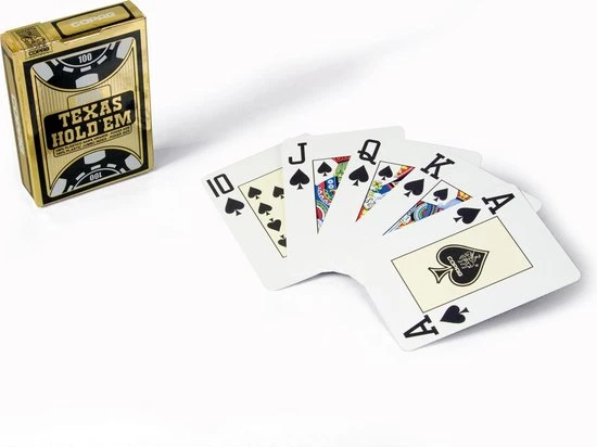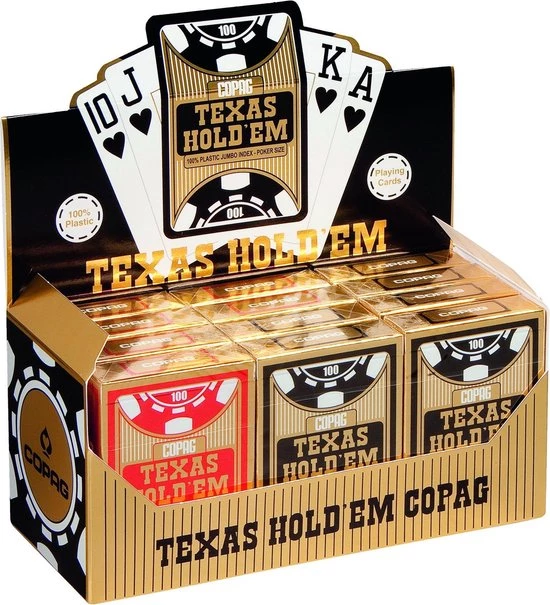 Copag Texas Hold?em Gold pokerkaarten in een display met 12 decks speelkaarten, Deze kaarten zijn speciaal ontwikkeld naar de wensen van pokerspelers wereldwijd, daarom ligt de nadruk vooral op het symbool die op de kaart staat, de symbolen zijn extra groot en extra duidelijk weergeven zodat je in een oogopslag kunt zien welke kaart op tafel ligt.