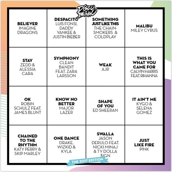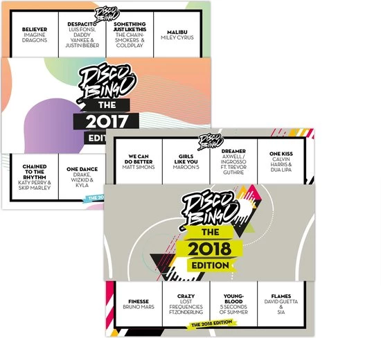 Twee kaartsets van elk 25 bingokaarten voor Disco Bingo The Game. H?t spel met de leukste hits. Bingokaarten gevuld met liedjes en artiesten i.p.v. saaie cijfers. Deze twee aanvulsetjes horen bij Disco Bingo The Game, ook te koop op bol.com. Dit zijn de beste hits van 2017 en 2018, verdeeld over diverse bingokaarten.