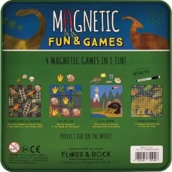 Floss & Rock Spelletjesdoos 4-in-1, Dinosaurus. Deze handige portable doos met een stoere dinosaurus-thema bevat maar liefst 4 magnetische spellen. Zoals het bekende boter, kaas en eieren en een woordzoeker. De set wordt geleverd inclusief uitwisbare pen en magneet-figuurtjes alsmede een dobbelsteen. Garantie voor urenlang speelplezier. Door de handige opbergdoos zijn de spellen makkelijk mee te nemen op reis, naar een restaurant of een dagje weg. Een ideaal cadeau voor een dino-fan!