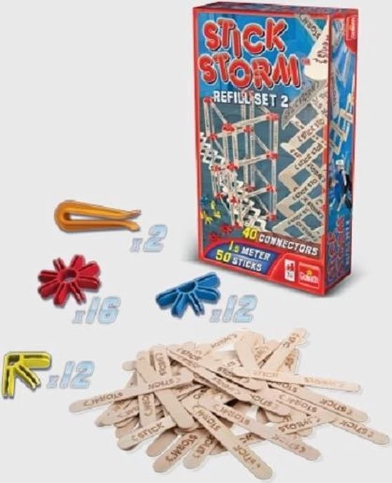 Een combinatie van spannende Stickstorm acties en verrassende stunts. Weef lange banen met de houten sticks van Stickstorm …..laat ze los en ze vliegen in een spectaculaire kettingreactie door de lucht! Met de verschillende koppelstukken en klemmen kun je hele constructies bouwen en deze combineren met de Stickstorm banen. Een aanvulset met 40 connectors en 50 sticks voor nog meer speelplezier!