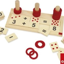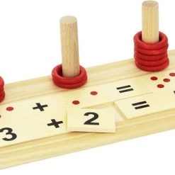 Houten spel om spelenderwijs te leren optellen en aftrekken. Met cijfers, afbeeldingen en hoeveelheden.