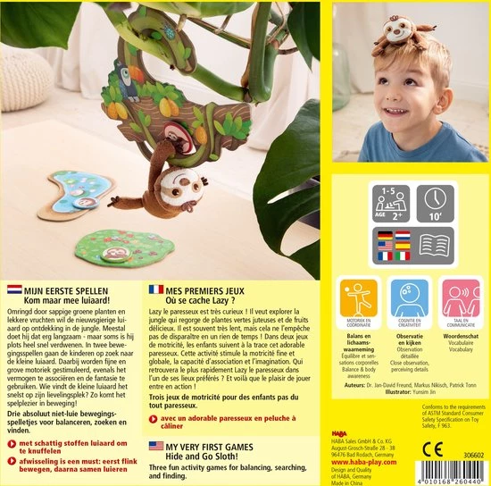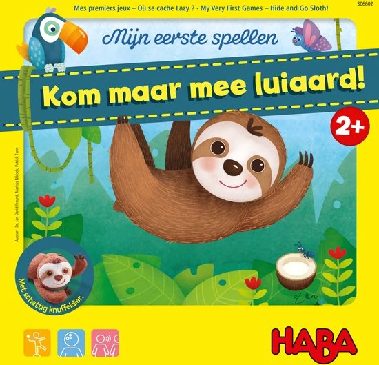 Haba mijn eerste spel: Kom maar mee Luiaard! 2+.Help jij de kleine luiaard naar al zijn favoriete plekjes toe? Of ga naar hem op zoek met dit leuke bewegingsspel! Het spel bestaat uit een schattige knuffelluiaard met magnetische handjes en kartonnen platen waar zijn favoriete plekjes op staan. Verspreid de favoriete plekjes over de kamer of zelfs over het huis en trek een kaartje. Op dit kaartje staat een van zijn plekjes, dus nu is het aan jou om de luiaard daar naartoe te brengen. Het spel kan ook gespeeld worden als zoekspel en er is een variant waarbij je de luiaard op een bepaalde manier naar de plekjes moet brengen. Het spel is zeer geschikt om kinderen te leren dat spel en beweging goed samengaan, traint de grove en fijne motoriek en is bovendien erg leuk om te spelen!