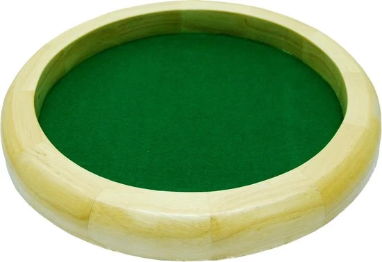 Dobbelpiste / pokerbak rond, blank gelakt rubberboomhout. Binnen en onderkant bekleed met groen vilt. Diameter 35 cm. randhoogte 34 mm. dikte 35 mm. Inclusief 5 houten dobbelstenen van 15 mm.