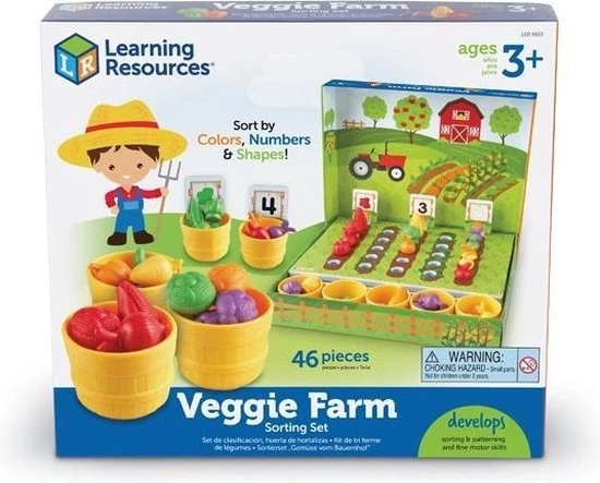 – Inclusief 46 stukken: tien tuinbordjes met kleuren, cijfers en groenten, vijf verschillende groenten in vijf kleuren (oranje, groen, paars, geel en rood), vijf houders voor de bordjes, vijf mini plastic schepels, EVA groentebedje-mat