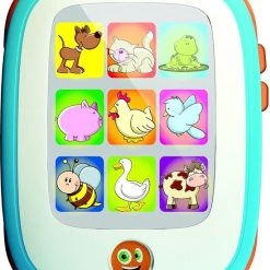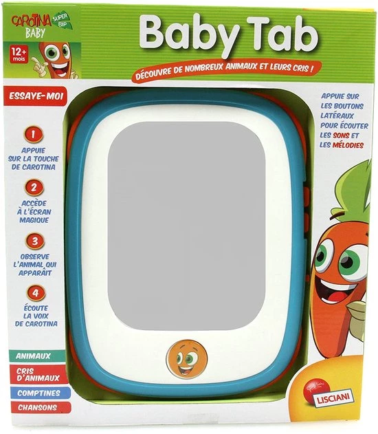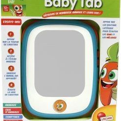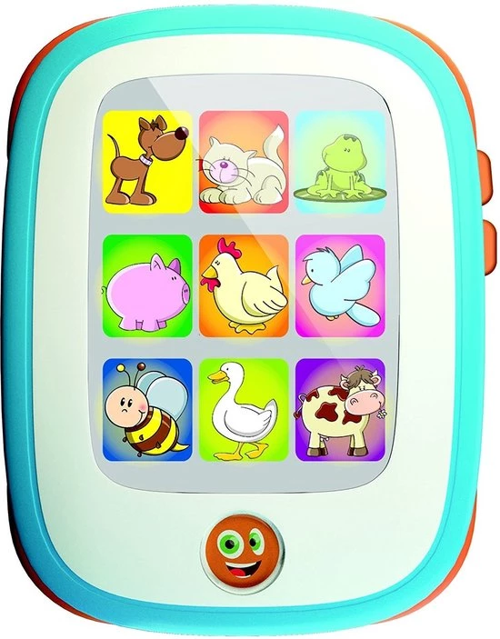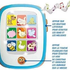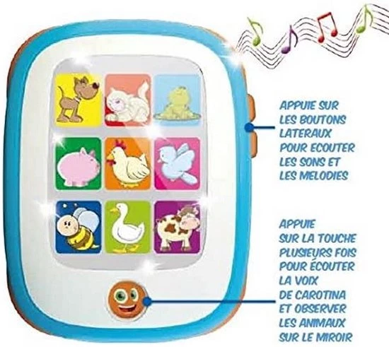 Une premi?re tablette pour les tout petits. L’?cran est un miroir dans lequel l’enfant d?couvrira son visage. Apr?s qu’il aura appuy? sur le gros bouton rouge, apparaitront de fa?on al?atoire des images d’animaux, qui seront nomm?s vocalement, et dont on entendra les cris. Alimentation par 3 piles R3 .