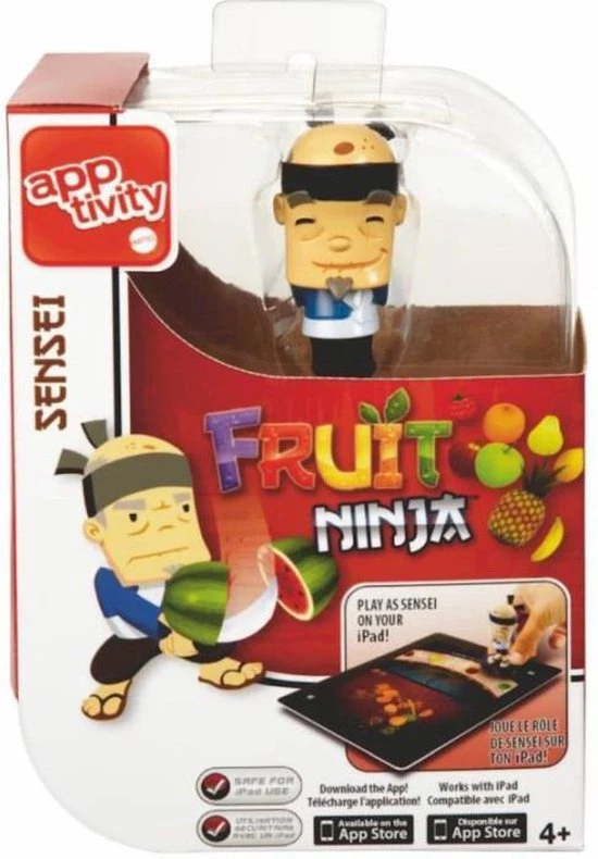 Kinderen leven zich uit met dit figuurtje inclusief touchscreen en accessoire, dat samen met de Fruit Ninja-app gebruikt kan worden. Dit is de eerste keer dat twee spelers samen een app kunnen spelen! Plaats het Sensei-figuurtje op het Mattel-logo en daag je vrienden uit in deze spannende nieuwe versie van Fruit Ninja, waarin twee spelers het tegen elkaar opnemen. De eerste speler voert Sensei-aanvallen uit vanaf de lopende band met fruit, terwijl de tweede speler een stuk fruit probeert te snijden. Spelers wisselen regelmatig van rol en de speler met de meeste punten wint. Als je een FN HD-app hebt, wordt de app automatisch bijgewerkt. Inclusief 1 Sensei-figuurtje voor twee spelers (1-speler stand is binnenkort ook beschikbaar). Vanaf 4 jaar.