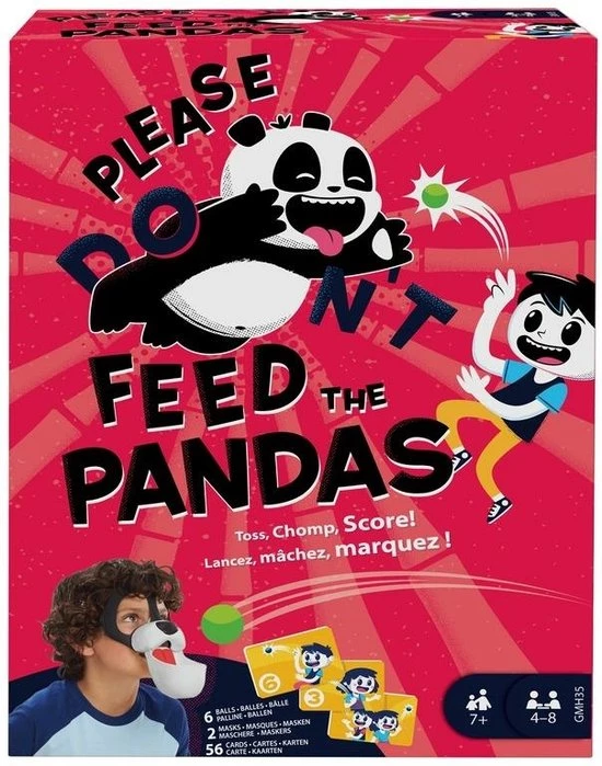 Please Feed the Pandas daagt spelers uit om te gooien en te vangen in een panda-voedende razernij. De panda’s hebben honger, maar ze moeten werken voor hun “eten”! Een teamgenoot, de Panda, draagt ??een pandamasker met een open mond om de ballen op te vangen, terwijl een andere, de Trainer, ze “voedt”. Trek een truckaart om te bepalen hoe je je panda moet voeren (stuiteren, over de schouder, enz.), En begin dan te gooien!
