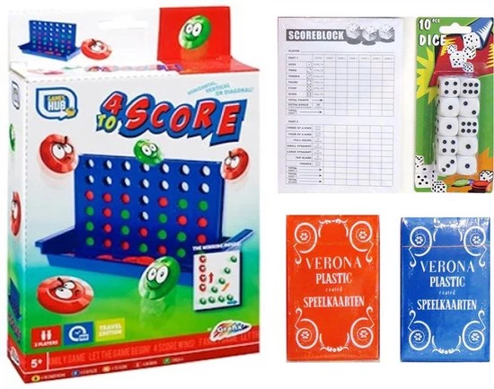 Een reis editie van het bekende spel 4 op 1 rij Handig voor tijdens vakantie of gewoon thuis. Naast dit 4 op 1 rij bevat dit pakket 10 dobbelstenen, Yatzee score kaarten en 2 pakken speelkaarten.