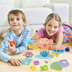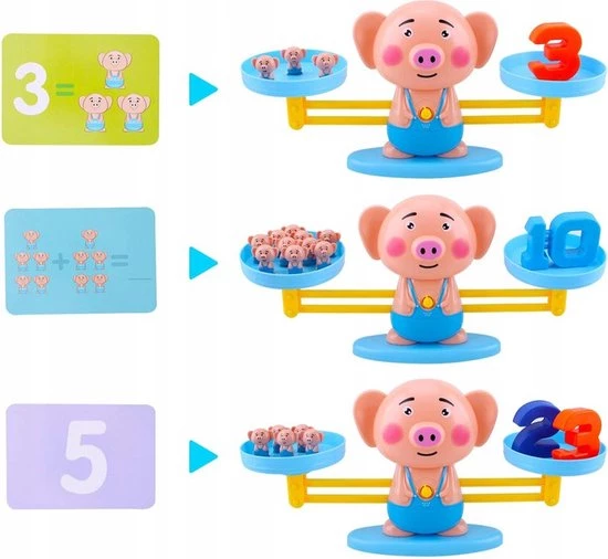 Kijk maar eens wat dit speelgoed te bieden heeft: een kleurrijke weegschaal met een varkensfiguur, biggengewichten, cijfers en opdrachtkaarten zorgen voor urenlang plezier en spannende ontdekkingen!