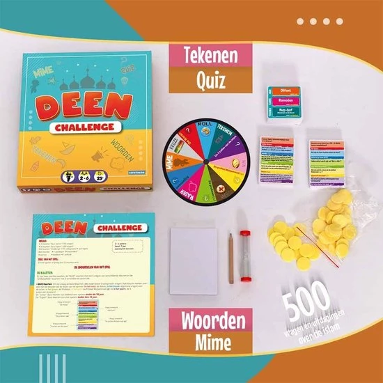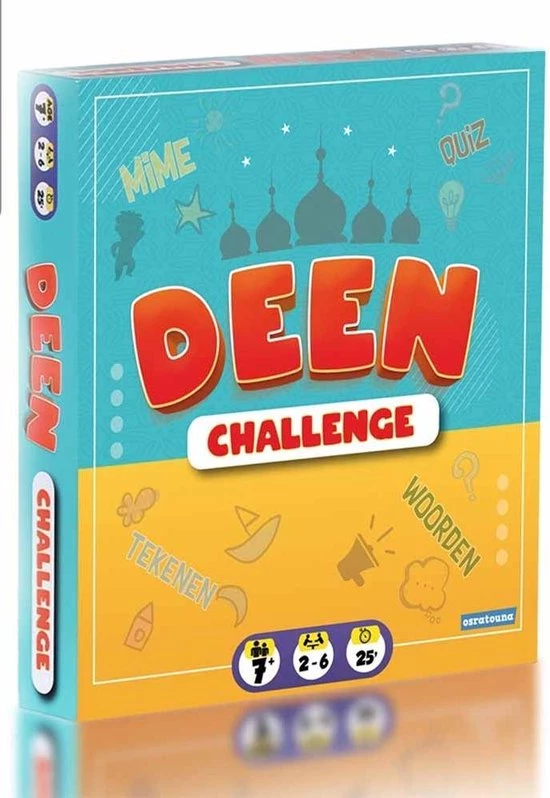 Deen Challenge is een leuke sfeerspel doe je zowel met familie en vrienden kan spelen. 500 Vragen en uitdagingen die je kennis en talent op proef stellen: Quiz, Mime, tekenen, woorden zoeken. Deen Challenge is het spel met een innovatief concept dat zowel ”junior” als ”expert” spelers aanspreekt. De spellen zijn zonder onderbreking aan elkaar gekoppeld, voor een super vriendelijk sfeer!