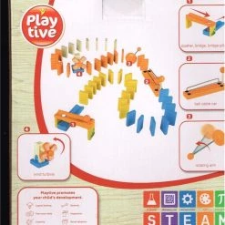 Bevat 51 dominostenen en 9 accessoires: 1x draaiende arm, 1x kogelkabelbaan, 1x windrad, 1x schuif, 1x brug