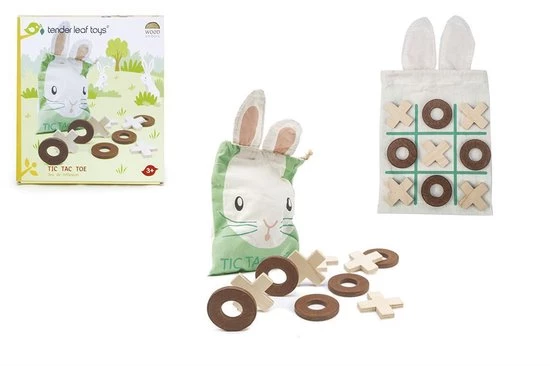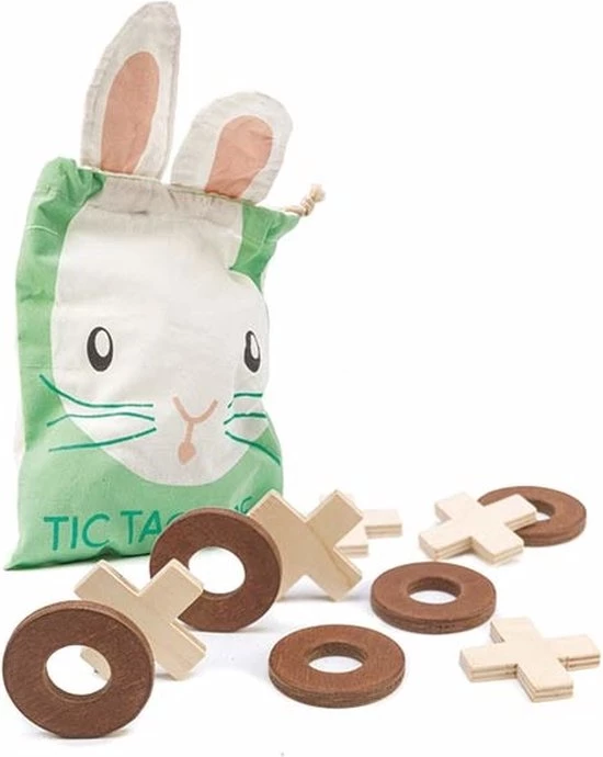 Beleef plezier met vrienden met een competitief spelletje Tic Tac Toe, ook wel OXO of boter – kaas – eieren genoemd. Een schattig konijnentasje met trekkoord is inbegrepen voor eenvoudig opbergen. Tip de nullen en kruisjes eruit en gebruik de achterkant van de zak voor het raster!