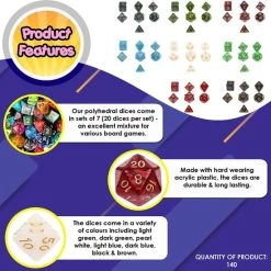 Deze mooie Dungeons & Dragons dobbelstenen van The Twiddlers zijn perfect om veel verschillende spellen mee te kunnen spelen! De dobbelstenen zijn onder andere geschikt voor het spelen van bordspellen, Yahtzee en Dungeons & Dragons en worden geleverd in sets van zeven stuks. In één setje zitten zeven dubbelstenen: D4, D6, D8, D10 (00-90), D10 (0-9), D12 en D20. De dobbelstenen zijn gemaakt van stevig en kleurvast acryl, waardoor ze duurzaam zijn en lang meekunnen. Deze set bestaat uit 140 stuks met allerlei verschillende prachtig gekleurde varianten.