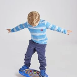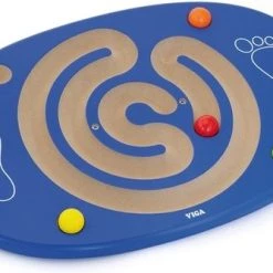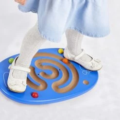 Een wiebelbord met 4 houten ballen. Door op het bord te staan ??en hun voeten in de voetafdrukken te plaatsen, moeten kinderen hun evenwicht en kernspieren gebruiken om de bal door de paden te rollen.