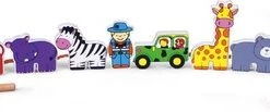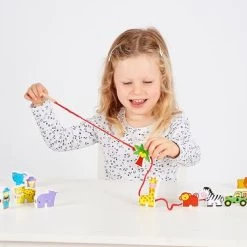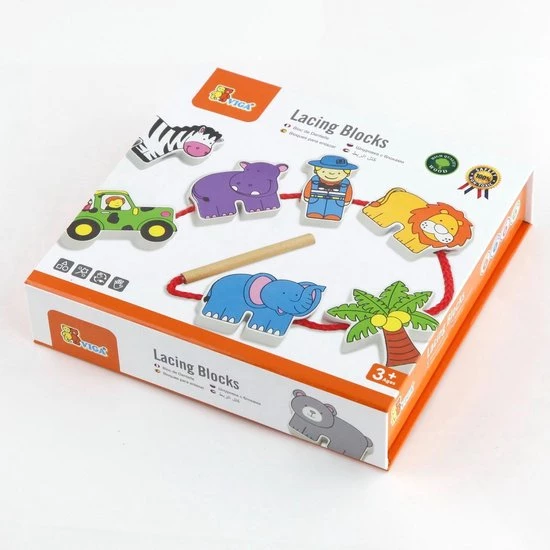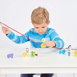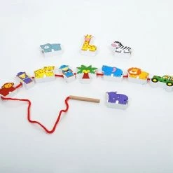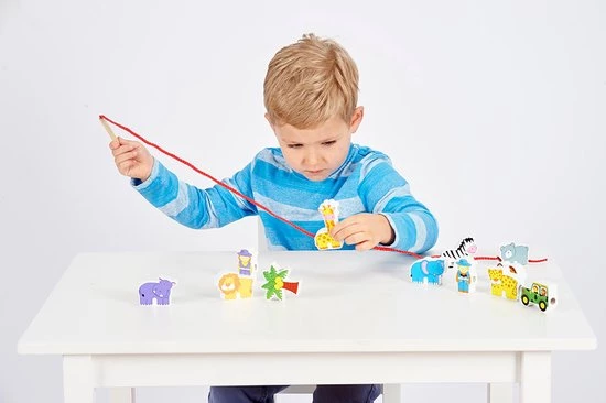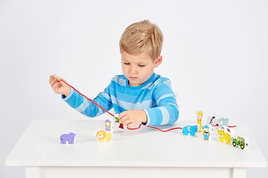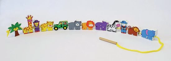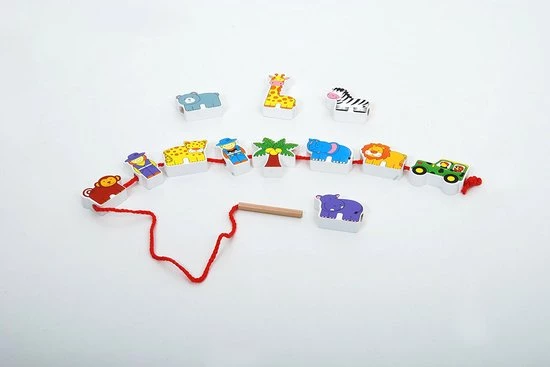 Deze twaalf kleurrijke verschillende dierentuin figuren kunnen gemakkelijk aan elkaar gerijgd worden. Het rijgkoord heeft een houten uiteinde en de figuren zijn dubbelzijdig bedrukt. Dit rijgspel is uitermate geschikt voor een goede ontwikkeling van de oog- handco?rdinatie en de fijne motoriek.