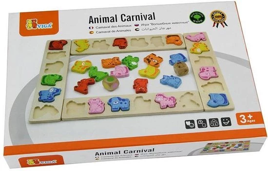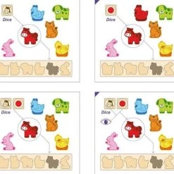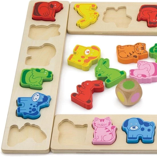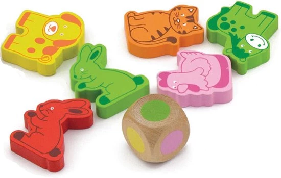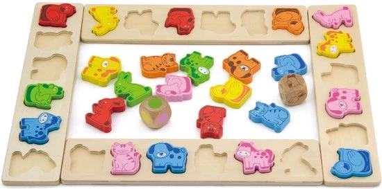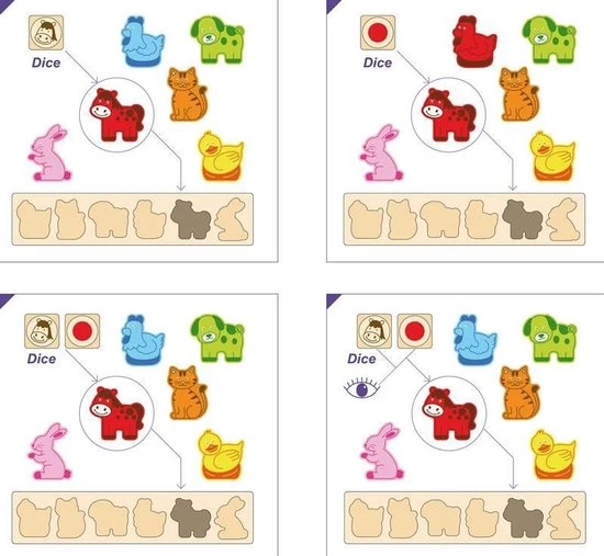 Een leuk en leerzaam spel waar dierfiguren en kleuren leren herkennen een onderdeel van is. Het spel bestaat uit 36 dierfiguren (6 verschillende dieren in 6 verschillende kleuren) en 2 dobbelstenen (1 met kleuren + 1 met dierfiguren) en kan op 4 manieren gespeeld worden. De laatste foto geeft deze duidelijk aan. De 4e manier stimuleert ook het reactievermogen v.h. kind want wie het eerst het juiste dier in de juiste kleur pakt mag het in zijn plankje leggen en wie zijn plankje het eerst vol heeft is uiteraard winnaar. Voor de allerkleinsten kan het spel ook gewoon als inlegpuzzel gebruikt worden!
