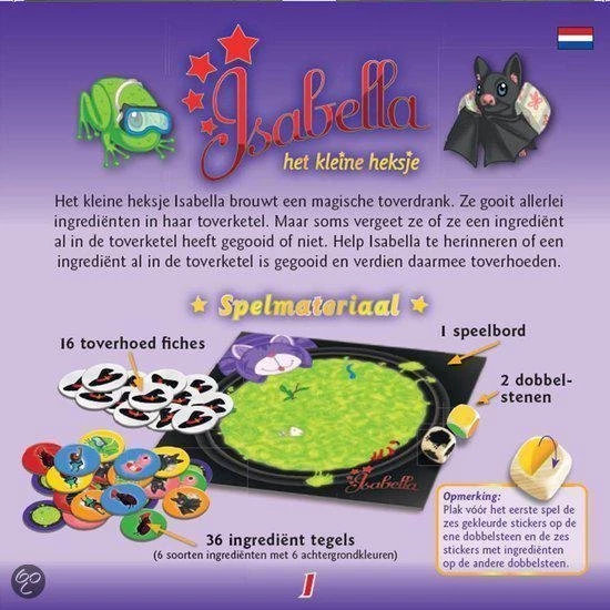 Het kleine heksje Isabella brouwt een magische toverdrank. Ze gooit allerlei ingredi?nten in haar toverketel: een groene kikker, een enge spin en zelfs een baby vleermuis! Maar soms vergeet ze of een ingredi?nt al in de toverketel is gegooid! Help Isabella dit te herinneren en verdien toverhoeden!